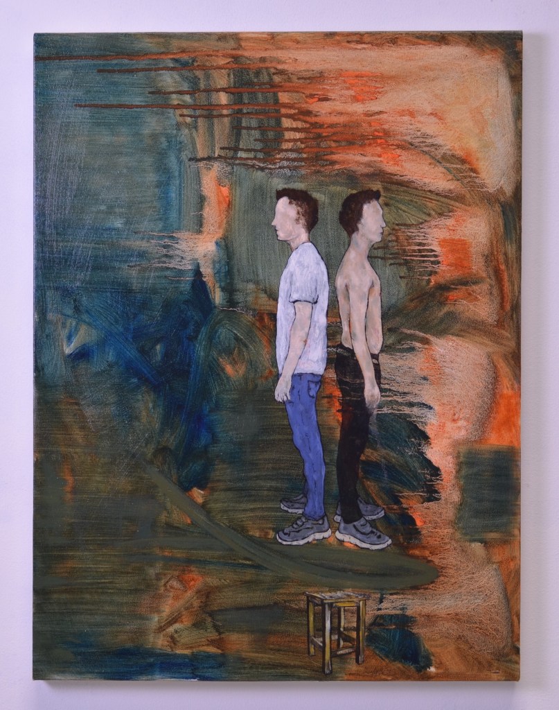 It is a raw and unflinching look at what it is like to grow up queer in a home that doesn’t always accept you. These paintings confront the tension between blood ties and the need to be yourself, revealing how love can feel conditional, how the very place meant to protect can instead become a prison, and how home, a space that should nurture, can sometimes feel like a cage. It is a home that demands you hide who you are in order to belong, a quiet, constant pressure that shapes every corner of your life. These works are portraits of that quiet oppression: the rooms that seemed to shrink with every secret kept, the years spent carefully measuring words and gestures, the small silences that were louder than any outburst.