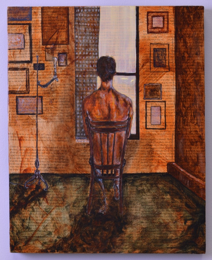 In my mind, I can almost hear the sounds of footsteps on the stairs, the knocks, and the distant echoes – imagining how Gregor might have felt: alone in his room, vulnerable and confused, as his body breaks apart and his world shatters. The sights, the smell, the dim light filtering through the window and the door frame, and even the fragile, yellowed pages of the book itself guide my artwork, inviting viewers to feel Gregor’s profound fear and uncertainty as he undergoes his unknown transformation.