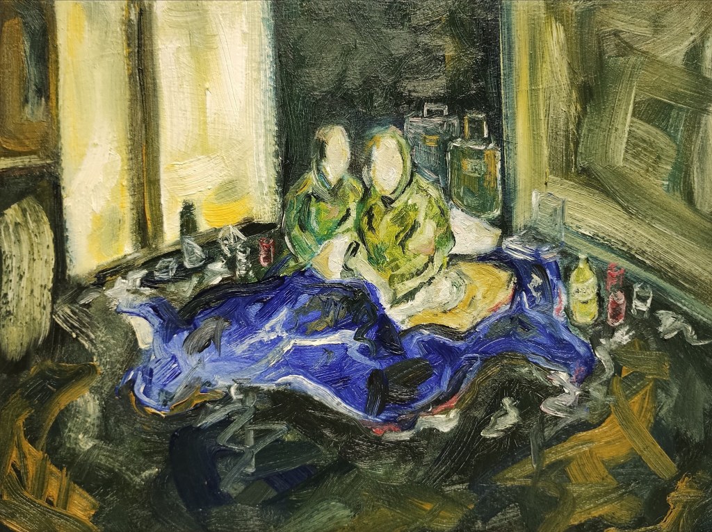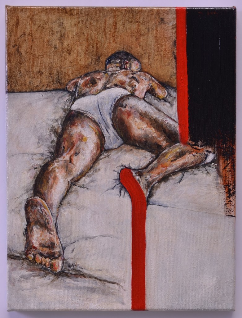 This painting captures the profound connection between physical pain and emotional expression. The red line and darker tones reflect the tension between vulnerability and resilience, blurring the boundary between internal suffering and external representation.